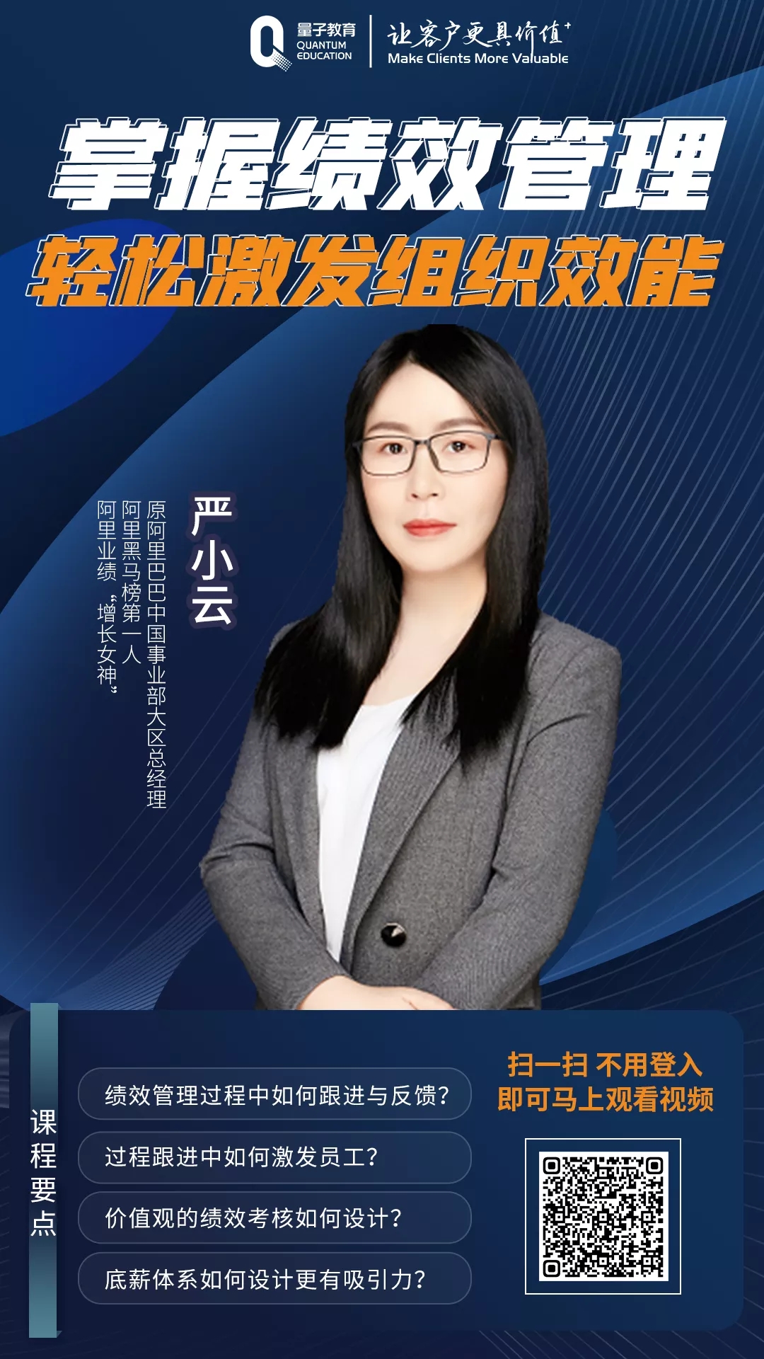 原阿里巴巴中國(guó)區(qū)事業(yè)部總經(jīng)理、阿里“增長(zhǎng)女神”嚴(yán)小云老師聯(lián)合量子教育推出了全新精品好課《掌握績(jī)效管理,輕松激發(fā)組織效能》。