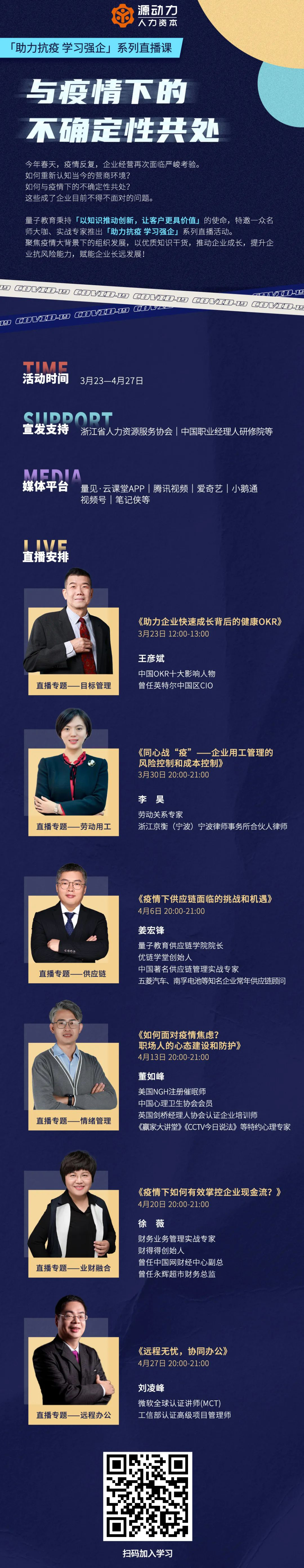 量子教育攜手一眾名師大咖、實(shí)戰(zhàn)專(zhuān)家聚焦疫情大背景下的組織發(fā)展,推出「助力抗疫 學(xué)習(xí)強(qiáng)企」系列直播活動(dòng),通過(guò)企業(yè)目標(biāo)管理、情緒管理、勞動(dòng)用工、業(yè)財(cái)融合、遠(yuǎn)程辦工、供應(yīng)鏈等多個(gè)維度提升企業(yè)抗風(fēng)險(xiǎn)能力,賦能企業(yè)長(zhǎng)遠(yuǎn)發(fā)展!